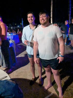 Welcome to Woody & the Snooze Beast — one of us is ready to yeehaw into freezing water… the other is still asleep in a onesie. Together, we plunge. (We're wearing onesies - Woody from Toy Story and Snorlax from Pokemon)